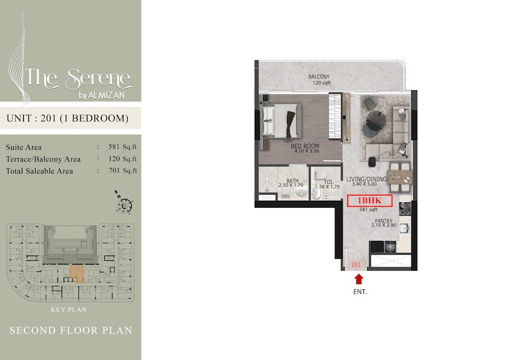 The Al Mizan The Serene offers various floor layouts, like,1 Bed,2 Beds,3 Beds,Studio.
