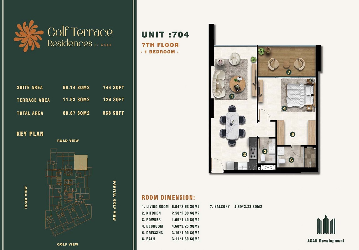 The ASAK Golf Terrace Residences offers various floor layouts, like,1 Bed,2 Beds,Studio.