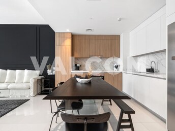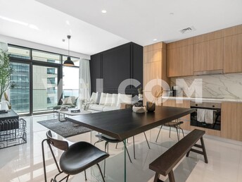 This 2-bedroom apartment in Damac Bay Tower C offers a luxurious waterfront living experience. The open-plan living and dining area connects to a mode